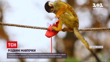 У лондонському зоопарку вже привітали з прийдешніми святами мавпочок саймірі. На деревах, де живуть тваринки, розвішали додаткові атракціони у вигляді червоних шкарпеток. А між ними у мішечках розклали частування – улюблені горішки.