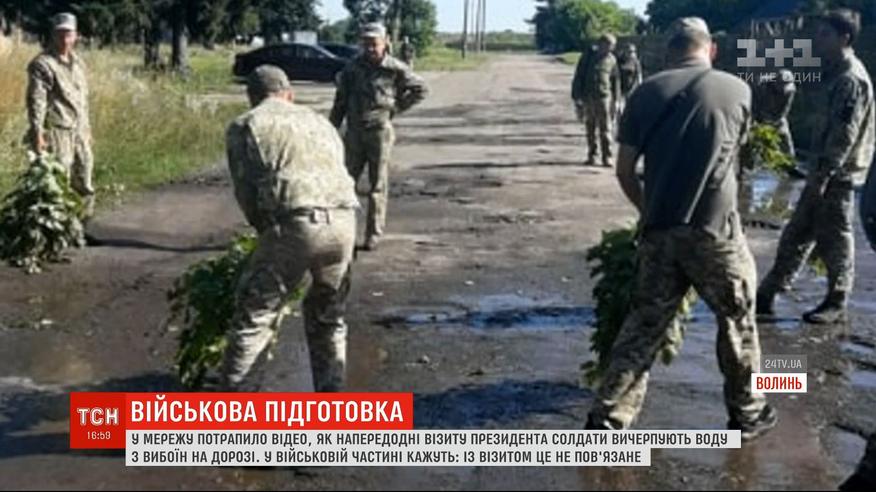 Скандальне відео з Луцька. Там напередодні візиту президента Зеленського військові пляшками вигрібали з вибоїн воду. На кадрах, які потрапили в інтернет, видно, як чоловіки в одностроях вичерпують воду, а також змітають її з дороги саморобними віниками з гілок. Усе це відбувалося на території військової частини 204-тої Севастопольської бригади тактичної авіації.