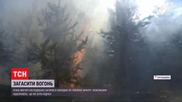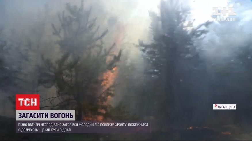Нова масштабна лісова пожежа в Луганській області. Пізно ввечері несподівано загорівся молодий ліс поблизу фронту. Пожежники кажуть: це також може бути підпал. Лише напередодні рятувальники вгамували полум'я, яке виникло одночасно на кількох ділянках лінії розмежування. Зараз на місці працює сотня вогнеборців. Вони намагаються втримати вогонь, щоб той не перекинувся на потужну газорозподільчу станцію.
