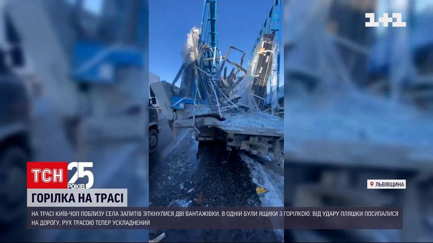 Міцна ДТП у Львівській області. Там трасу "Київ-Чоп" залило горілкою й усіяло склом. Аварія сталася поблизук села Запитів: зіткнулося дві вантажівки. Відомо, що обидві фури їхали в напрямку Львова. Водій, що перевозив горілку, твердить: у нього відмовили гальма, через це від в’їхав у попутний ваговоз, що перевозив вікна. Водії вціліли. А от вікна та пляшки - ні.