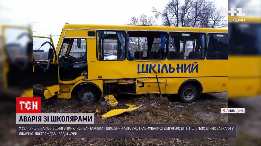 Дев'ятеро дітей постраждали в аварії у Львівській області. У селі Бишів вантажівка зіткнулася зі шкільними автобусом. В його салоні у цей час було 12 учнів. Шістьох із них з місця ДТП забрали швидкі. В одного травмованого хлопчика зламана нога, у решти дітей підозри на струс мозку та забиття. Трьом школярам допомогу надали на місці і відпустили. Також у лікарні обстежують водія вантажівки.