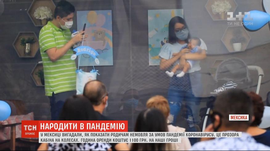 Як показати родичам немовля, коли за вікном – пандемія коронавірусу? Відповідь знайшли в Мексиці. Це - прозора кабіна на колесах. Працює на замовлення. Процедура зазвичай така: всередині – щасливі батьки із немовлям на руках. Назовні – найближчі родичі: бабусі, дідусі та хрещені. Впритул не підходять, стоять на відстані. Фотографуються теж через скло. Година оренди такої кабіни коштує близько тисячі ста гривень на наші гроші. Після кожного клієнта у ній проводять ретельну дезінфекцію.