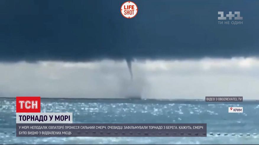 Торнадо у Криму. У морі поблизу анексованого півострова пронісся великий смерч. Це сталося неподалік Євпаторії. Торнадо вдалося зафільмувати очевидцям, його було видно з берега і навіть із віддалених від моря місць. Інформації про руйнування чи травмованих людей немає.