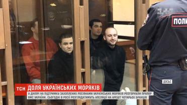 У Дніпрі на підтримку полонених українських моряків розгорнули прапор ВМС. Люди, що прийшли підтримати їх, кажуть - зараз головне, аби бранці знали - на них чекають удома. Сьогодні у Москві продовжиться судилище над українцями. Там судді розглядатимуть апеляційні скарги чотирьох українських моряків - Віктора Беспальченка, Владислава Костишина, Володимира Лісового та Володимира Варимеза.