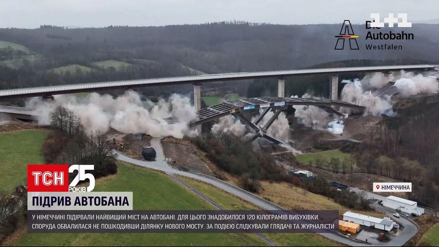 Контрольований вибух. Найвищий міст на автобані підірвали в Німеччині. Аби знести переправу заввишки 70 метрів і завдовжки півкілометра знадобилося 120 кілограмів вибухівки. Після детонації 55-річна споруда з гуркотом обвалилася, не пошкодивши ділянку нового мосту поруч. На час підриву поліцейські перекрили район.