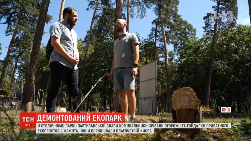 Демонтований екопарк. У столичному Парку партизанської слави комунальники зрізали огорожу та гойдалки приватного екопростору. Власники бізнесу кажуть - їхнє майно вилучили незаконно, у міськвладі ж твердять - підприємці мали порушення благоустрою. Докладніше - у сюжеті.