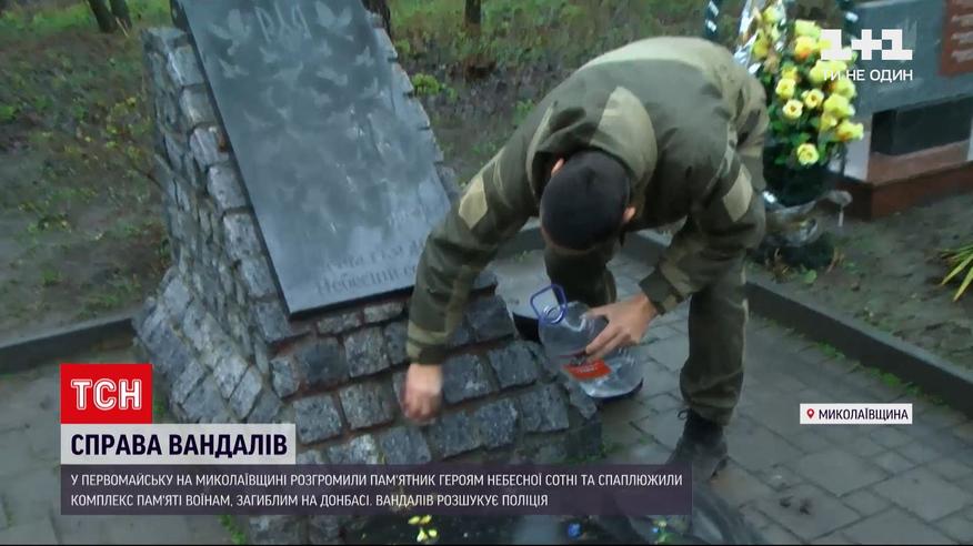 Пам'ятник Героям Небесної Сотні розгромили у Первомайську у Миколаївській області. Вандали розбили не лише цей меморіал, але й поглумилися над комплексом пам'яті загиблим воїнам на Донбасі. Їхні прізвища залили червоною фарбою і осквернили надписами. Вандалів шукає поліція.