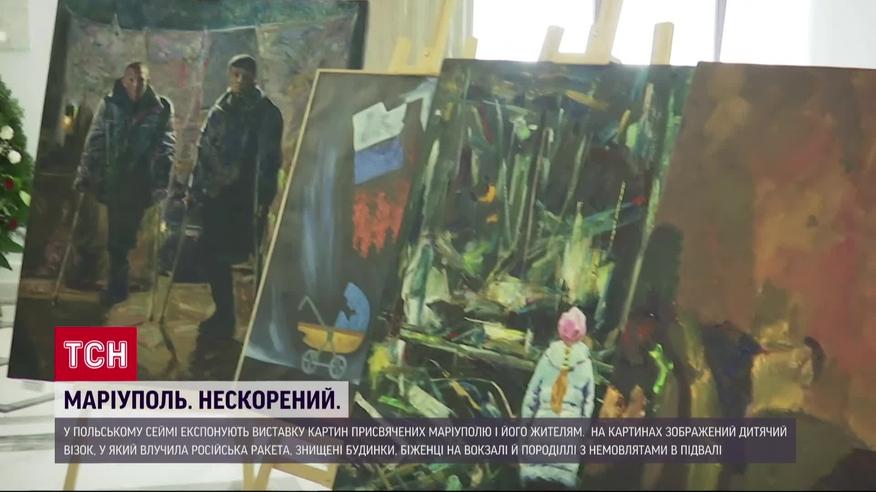 "Маріуполь. Нескорений". У польському Сеймі експонують виставку картин, присвячених місту-герою, його жителям і захисникам. Полотна майже пів сотні українських митців пронизані болем і сумом, але водночас надією і вірою в перемогу, гордістю за хоробрих захисників. На картинах зображений дитячий візок, у який влучила російська ракета, знищені будинки цивільних, скалічені військові, біженці на вокзалі й породіллі з немовлятами в підвалі пологового. Це, як арт-свідчення воєнних злочинів, які Росія вчиняє проти України. На відкриття виставки запросили дипломатів багатьох країн, щоби вони на власні очі побачили страшну правду про війну, про звірства росіян і звитягу українського народу.