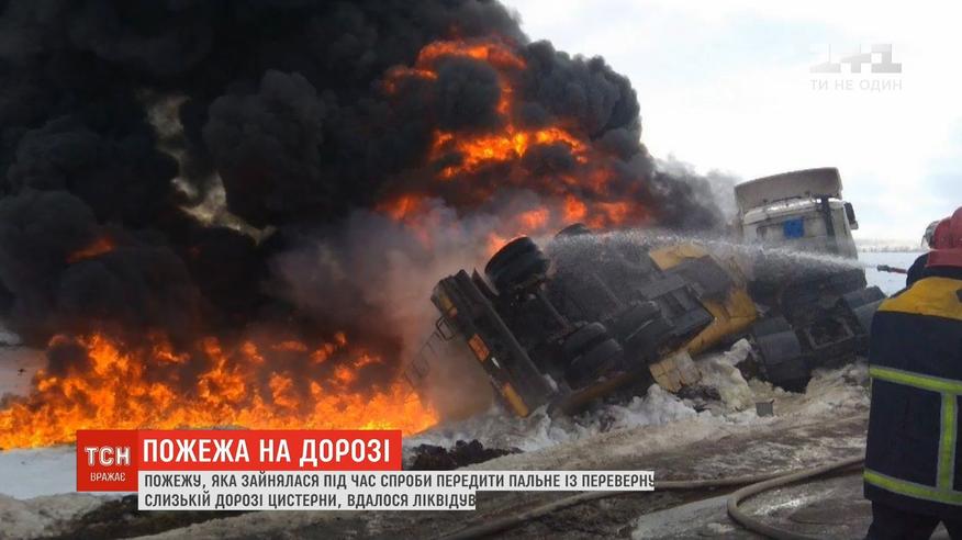 Кілька годин сьогодні полтавські рятувальники гасили вантажівку, що перевозила цистерну з пальним. Напередодні на автошляху Миргород-Великі Сорочинці через слизьку дорогу перекинулася автоцистерна.