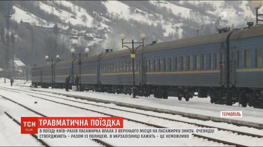 З верхнього місця в потягу - на пасажирку знизу. Разом із полицею - кажуть очевидці. Без - запевняє "Укрзалізниця". Інцидент стався у поїзді Київ-Рахів. І пасажирка з нижнього місця - з розтрощеним тазом у лікарні.