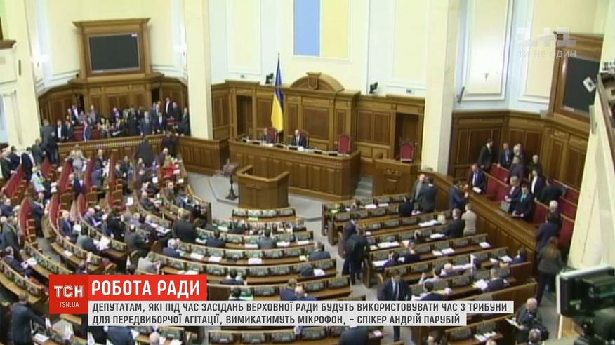 Особливості роботи парламенту у передвиборчий період. Спікер Парубій на першому засіданні нової сесії попередив депутатів, що у найближчі кілька місяців відключатиме мікрофон усім, хто буде використовувати його для передвиборчої агітації.
