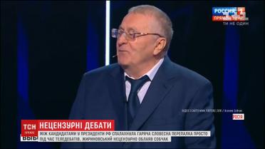 Лідер ЛДПР Володимир Жириновський у притаманній йому манері емоційно почав відповідати своїм візаві. До гарячої сварки долучилася кандидатка Ксенія Собчак. Коли Жириновський попросив її замовкнути, та вилила на нього склянку з водою. У відповідь отримала купу образ, ще й нецензурних.