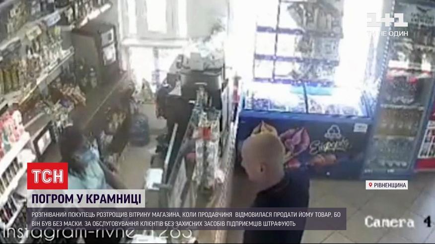 Розтрощив вітрину крамниці за відмову продати товар без маски. Як розгніваний покупець розбиває вітрину магазину неподалік Рівного - зафіксувала камера відеоспостереження. Чоловік зайшов до крамниці за покупками без маски, та після зауваження продавчині і відмови продавати товар вчинив сварку та погром. До слова, у Рівненській області при вході до усіх крамниць є оголошення про обов'язковість заходити у масках, а за обслуговування клієнтів без них підприємці отримували штрафи.