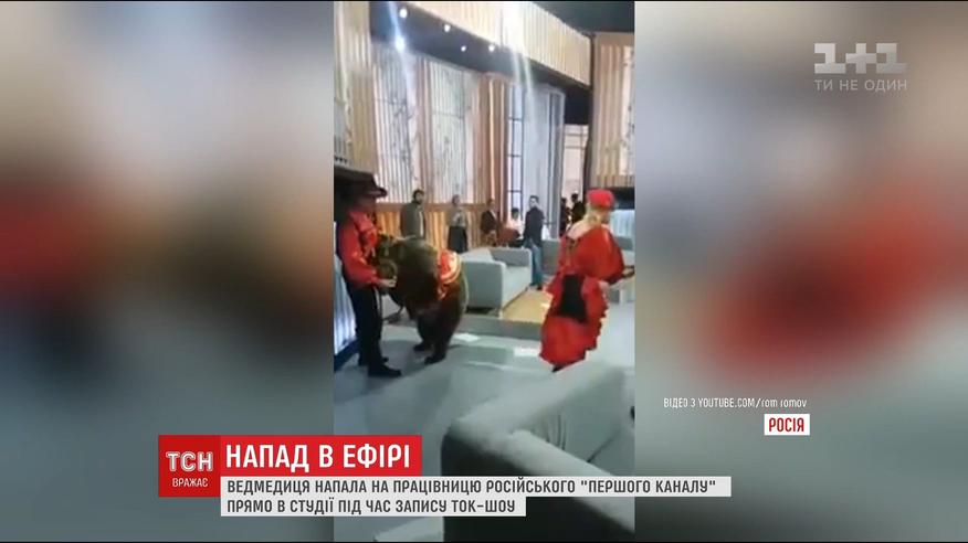 На кадрах, знятих свідком, видно, як жінка підійшла до дресирувальника та звіра і простягнула руку до ведмедиці. Та, вочевидь, злякалась, і вдарила співробітницю каналу лапою. Жінка впала на підлогу, та їй швидко допомогли підвестися. Вона не постраждала. А от дресирувальнику довелося заспокоювати звіра і нагадати телевізійникам, що без дозволу ведмедицю краще не чіпати.