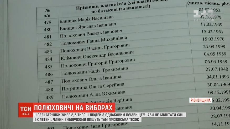 У селі Серники по-особливому готуються до виборів. А все тому, що там живуть понад 2,5 тисячі людей із прізвищем Полюхович. Щоб не плутатися хто є хто, члени виборчої комісії, серед яких теж більшість Полюховичів, на запрошеннях пишуть прізвиська односельчан і лише потім вручають їх адресатам.