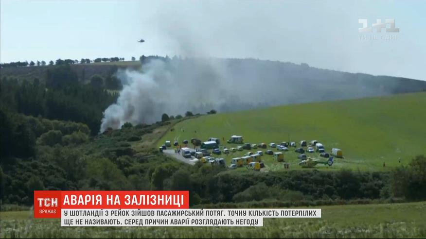 У Шотландії із рейок зійшов пасажирський потяг. Постраждало кілька людей. Точну кількість ще поки не називають. За неофіційними даними, загинув машиніст. До місця аварії нікого не підпускають. Здаля видно лише густий дим. Рятувальники розповідають, з рейок зійшли локомотив та три із чотирьох вагонів. На місці працюють два медичні вертольоти та три десятки машин рятувальників. Серед ймовірних причин аварії - сильні дощі, які останніми днями призвели до паводків та зсувів ґрунту.