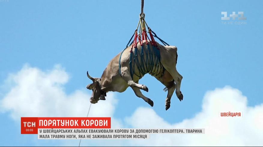 У швейцарських Альпах корова мала травму ноги, яка не заживала протягом місяця. Тож, коли настала пора переганяти корів з верхнього пасовища униз, сама спуститися з гір вона вже не могла. Фермер вирішив не ризикувати і замовив спеціально для рогатої гвинтокрил. У долині корова опинилася за лічені хвилини. А от решті тварин зі стада довелося йти пішки.