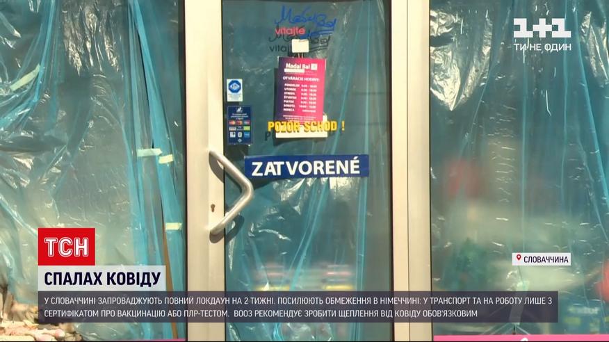 Словаччина від сьогодні закрилася на жорсткий локдаун із комендантською годиною. І триватиме він щонайменше два тижні. Працювати дозволять лише магазинам товарів першої необхідності. Минулої доби в країні вперше від початку пандемії зафіксували понад 10 тисяч нових випадків коронавірусу. Раніше повний локдаун запровадили також Австрія і Чехія. Посилили карантинні обмеження і в Німеччині - користуватися транспортом та перебувати на робочому місці там можна лише вакцинованим, перехворілим або з ПЛР-тестом, зробленим в останні 24 години.