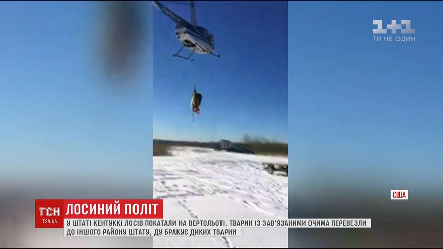 В штаті Кентуккі помітили диких тварин на гелікоптерах. Перевозити їх у такий незвичайний спосіб вирішили чиновники, що опікуються охороною природи. Лосям зав'язували очі і у спеціальній люльці гвинтокрилом доправляли до автомобілів, які мали їх транспортувати в інший району штату.