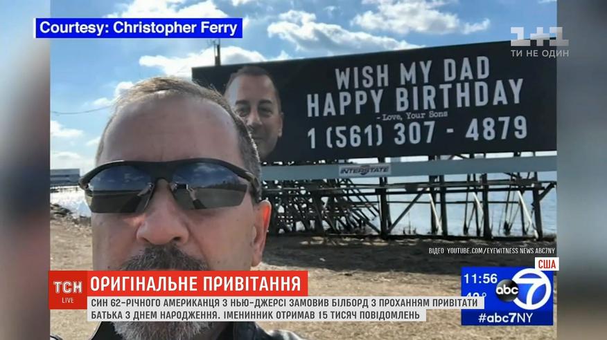 Американець зі штату Нью-Джерсі за кілька днів отримав 15 тисяч поздоровлень. А все через бажання синів оригінально привітати свого батька з днем народження. Той встановив білборд з його портретом і номером телефону. Імениннику Крісу Феррі почали дзвонити та надсилати повідомлення з усього світу.