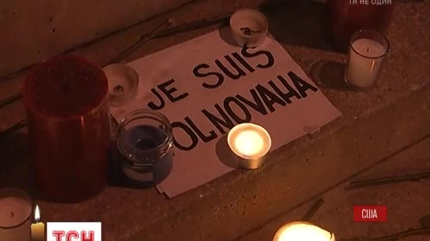 В Вашингтоні під посольство України приходять люди. Вони несуть квіти і свічки цілими сім’ями і навіть маленькі діти тримають в руках написи “Je Suis Volnovakha”.