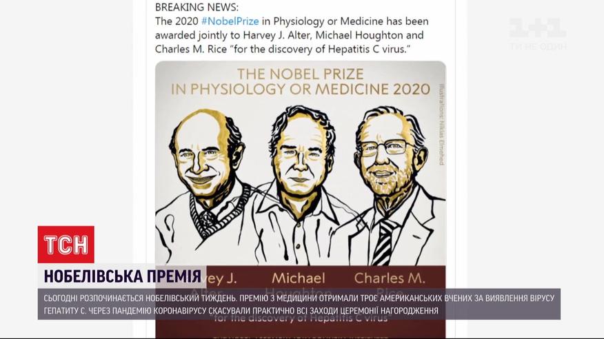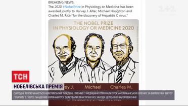 Допомогли врятувати мільйони життів - у Стокгольмі оголосили нобелівських лауреатів з медицини. Цього року нагороду розділили троє американських учених за виявлення, дослідження та розробку ліків від гепатиту С. Нобелівський комітет оголошуватиме лауреатів упродовж тижня. Завтра – з фізики. Далі - хімія, література та премія за миротворчі зусилля. Лауреата в сфері економіки назвуть 12 жовтня.