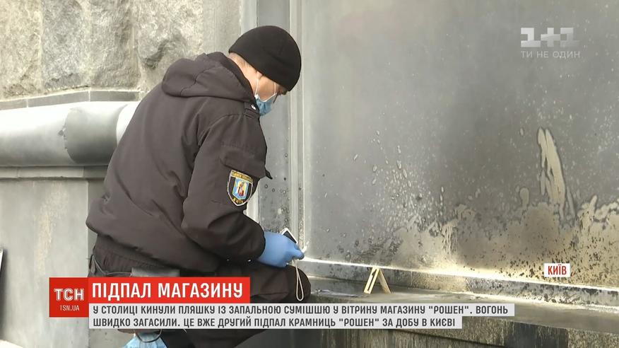 У Києві горить другий за добу магазин Roshen. Учора проти ночі спалахнула крамниця поблизу метро "Героїв Дніпра". Сьогодні у вітрину на Хрещатику кинули ємкість з вибуховою речовиною. Працівники магазину загасили вогонь так швидко, що пожежа не встигла помітно пошкодити вітрину.