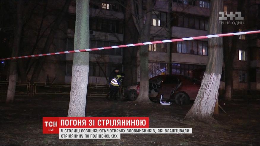 До операції долучили і кінологів. Надвечір патрульні отримали повідомлення про підозрілий легковик на іноземних номерах. Машину знайшли у Подільському районі столиці. Правоохоронці попросили водія показати документи, той почав тікати. Під час переслідування пасажири легковика відстрілювалися у патрульне авто із вогнепальної зброї.