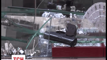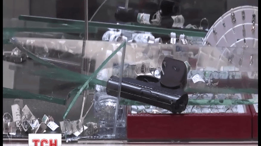 Події зафільмувала камера відеоспостереження: чоловік у темному одязі, в рукавичках та медичною маскою на обличчі забіг в магазин. Погрожуючи пістолетом, змусив продавця відійти від вітрин, розбив скло, забрав лоток із прикрасами, потім повернувся іще за одним. Відтак, забрав із півсотні одиниць ювелірних виробів.