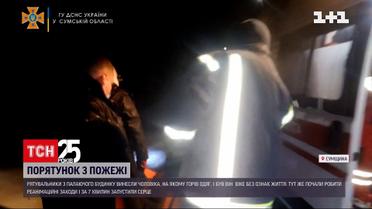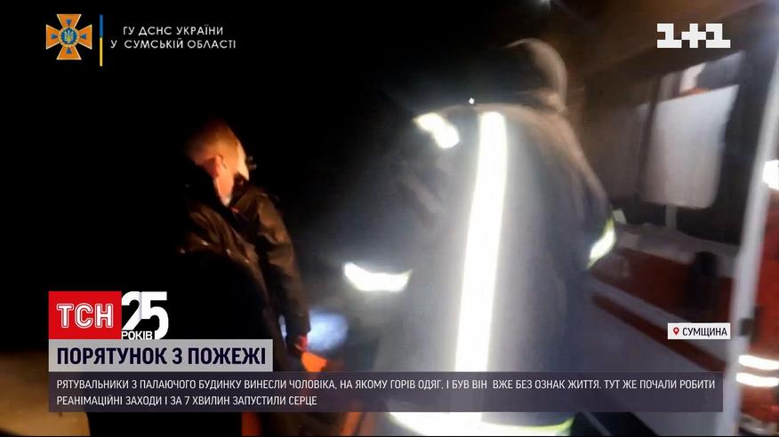 Його в містечку Шостка винесли з палаючого будинку. Господаря помешкання рятувальники знайшли вже без ознак життя, на ньому палав одяг. Ось на цих кадрах командир пожежно-рятувального відділення невпинно проводить реанімаційні заходи і за 7 хвилин серце чоловіка знову починає битися. Постраждалого передали медикам. Нині він в реанімації.