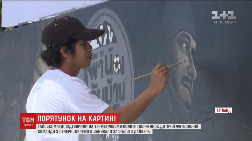 Ініціювала ідею громадська організація митців. Над грандіозним полотном працювало понад три сотні художників. Вони прагнули увічнити і дітей, і всю пошуково-рятувальну команду. Поруч з юними футболістами зображені губернатор, карети швидкої і шляхетні водолази. З-поміж усіх митці виокремили портрет загиблого дайвера - Самана Гунана.