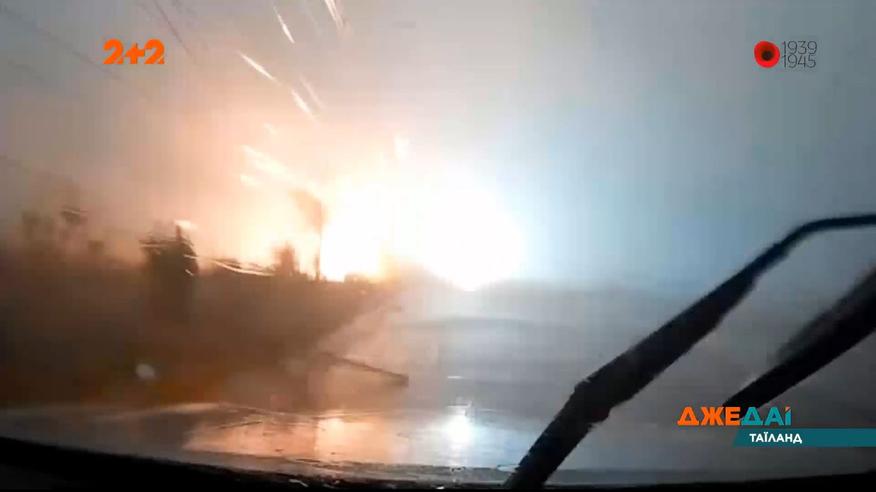 На той світ мало не відправив тайського водія звичайний буревій. Зненацька, просто перед ним штормовий вітер повалив на дорогу електричні стовпи. Дроти луснули й на дорозі затанцювали електричні розряди. Керманич не розгубився й швидко звернув на путівець подалі від небезпеки. Повні випуски дивіться на 1+1 video