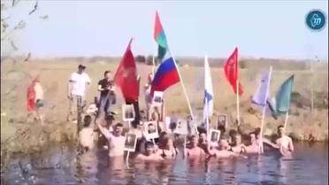 У російської Тюмені моржі влаштували з нагоди Дня перемоги 9 травня заплив у місцевій водоймі із триколорами та портретами ветеранів.