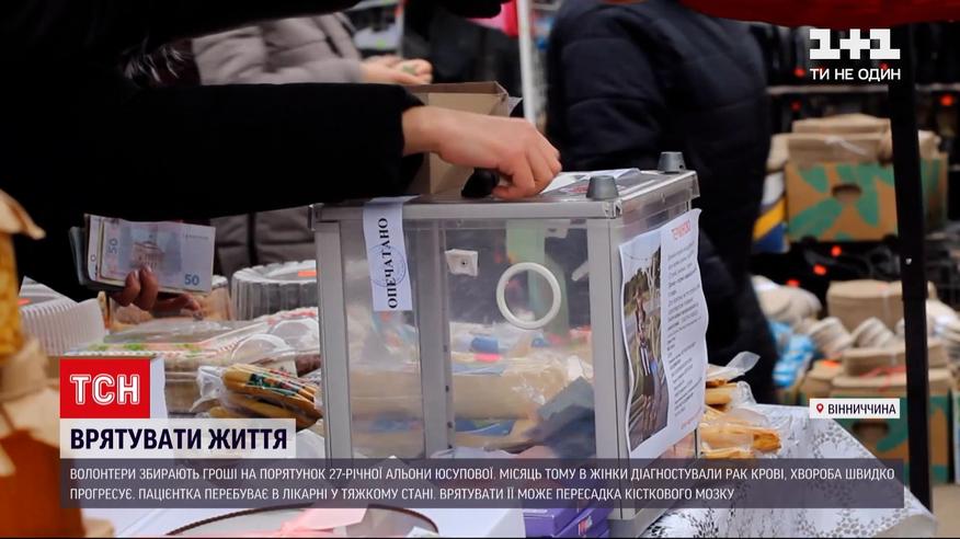 У Вінницькій області волонтери збирають гроші на порятунок 27-річної Альони Юсупової. Місяць тому у неї діагностували рак крові. Хвороба швидко прогресує. Жінка у тяжкому стані в лікарні, їй кілька разів на тиждень переливають кров. А вдома на неї чекають чоловік та двоє донечок .Врятувати Альону може трансплантація кісткового мозку. На операцію треба понад 4 мільйони гривень. Зібрати рідні спромоглися поки четверту частину цієї суми. Аби допомогти зі збором грошей - у рідному містечку Альони Бар влаштували благодійний ярмарок. Продавали містяни тут солодощі, прикраси й навіть побутову техніку. За кілька годин назбирали понад 50 тис грн.