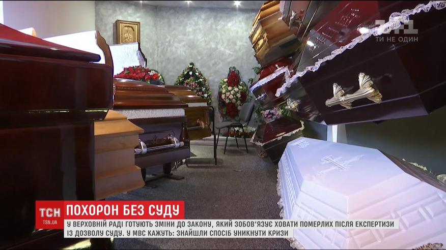 У МВС запевняють: знайшли спосіб, як уникнути так званого похоронного армагеддону. Щоби уникнути кризи, поліція, прокуратура та судмедексперти домовились про тимчасову процедуру. У разі, якщо смерть настала з природних причин, похорон дозволятимуть без санкції суду. У Верховній Раді терміново готують зміни до недолугого закону.