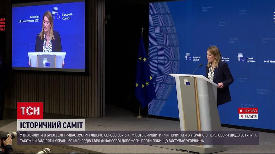 Історичний саміт. У ці хвилини в Брюсселі триває зустріч лідерів Євросоюзу, які мають вирішити чи починати з Україною переговори щодо вступу, а також чи виділяти Україні 50 мільярдів євро фінансової допомоги. Проти поки що виступає Угорщина, але її намагаються переконати інші лідери. До очільників ЄС онлайн уже звертався і український президент Володимир Зеленський. Докладніше про перший день саміту розкаже журналістка ТСН Оксана Ткаченко.