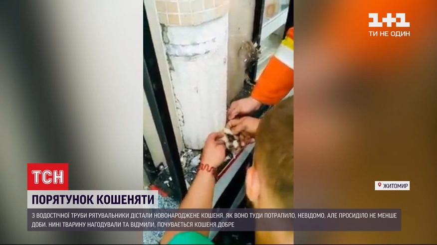 Порятунок кошеняти у Житомирі. Малечу діставали з забетонованої труби. М`явчання звідти почули працівники маркету. І побачили, що тварина застрягла у непрацюючій водостічній трубі, яка ще й забетонована з одного боку. Самостійно дістати тварину продавці не змогли, тож зателефонували рятувальникам та зоозахисникам. Бетонну трубу бійці ДСНС розбили, і звідти дістали ледь живе котеня. Як воно туди потрапило, невідомо.
