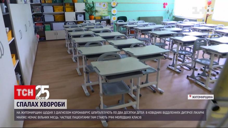 Спалах дитячого коронавірусу в Житомирській області. Там щодня шпиталізують по два десятки малюків. І так від початку тижня. Переважно до медзакладу потрапляють учні початкової школи. "Ковідні" відділення міської дитячої лікарні майже забиті ущент. У міській раді кажуть: такої кількості хворих дітей не було навіть коли регіон був у червоній зоні. Також ситуацію ускладнює і грип.