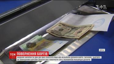 НБУ за два дні має сплатити МВФ 460 мільйонів доларів боргу. З усієї суми 373 мільйони - це основний борг, який Україна повернула вже учора. Сьогодні ж на рахунки МВФ від України має надійти ще й оплата відсотків - 87 мільйонів доларів. Проблем з валютою, переконують в НБУ, в країні не буде. Резерви сподіваються поповнити за рахунок чергового кредитного траншу від МВФ.