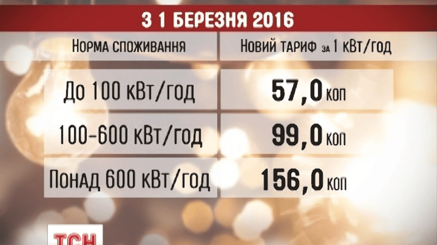 Нові тарифи на світло запрацюють першого березня. Це буде вже втретє за останній рік, відколи уряд запровадив поетапне підвищення вартості світла. Електрика подорожчає приблизно на 10-20 копійок. До 100 кіловатів - це буде 57 копійок. До 600 - 99. І більше 600 – 1 грн 56 копійок. Такі тарифи діятимуть до 1 вересня 2016. А далі вони знову зростуть.