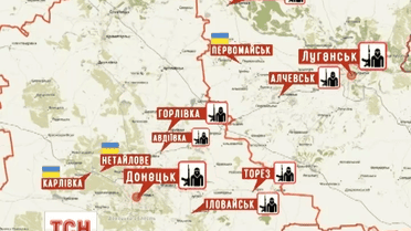 Це Карлівка та Нетайлове - на Донеччині, і Первомайськ - на Луганщині. Над адмінбудівлями там підняті українські прапори. Як повідомляють у РНБО, наразі триває операція з оточення Донецька, бої точаться за Лисичанськ.