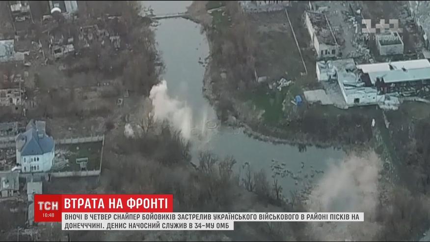 Вночі в районі Пісків на Донеччині загинув український воїн. Снайпер бойовиків застрелив Дениса Начосного, бійця 34 окремого мотопіхотного батальйону, жителя Генічеська. Цю інформацію оприлюднили ЗМІ Херсонщини. Чоловік щойно повернувся із відпустки на передову.