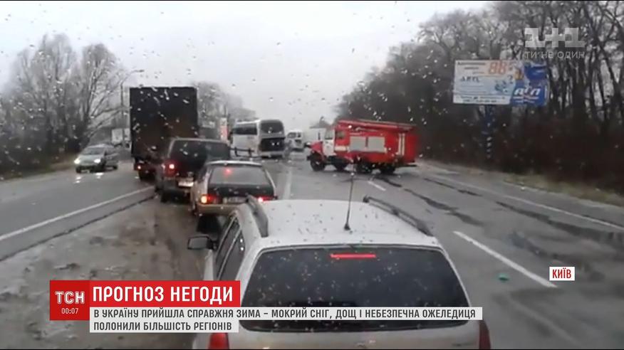 Мокрий сніг, дощ і небезпечна ожеледиця. Така сьогодні погода в більшості регіонів України. Через туман і слизькі дороги на Полтавщині десятки автобусів не випустили в рейс. У Києві і передмісті затори. У Дніпрі та Запоріжжі переповнені травмпункти і затримані авіарейси. І, кажуть, що це лише початок.
