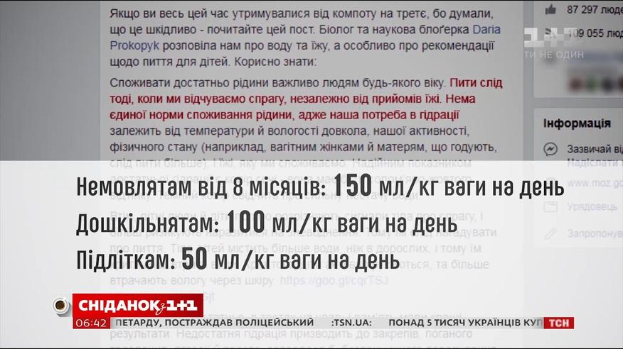 За словами пані Уляни, нема єдиної норми споживання рідини, адже наша потреба в гідрації залежить від температури й вологості довкола, нашої активності, фізичного стану. І насамперед постійне пиття води має бути у дітей. Пані Уляна радить: на день немовлятам від 8 місяців - по 150 мілілітрів на кілограм ваги на день, дітям дошкільного віку - 100 мілілітрів, підліткам – 50.