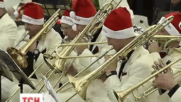 Музиканти Київського академічного муніципального духового оркестру одягли на себе червоні шапочки, щоб в них з особливим настроєм протягом двох годин відіграти як шедеври світової класики, так і просто популярні різдвяні хіти.