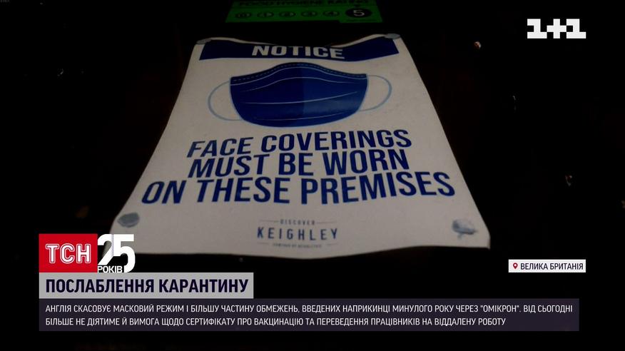 Англія скасовує масковий режим і більшу частину обмежень, введених через появу штампу "Омікрон" наприкинці минулого року. Від сьогодні за рішенням британського уряду більше не діятиме вимога щодо сертифікату про вакцинацію, носіння масок у громадських місцях та переведення працівників на віддалену роботу. За словами прем'єр-міністра Великої Британії, у цьому вже немає потреби, оскільки хвиля поширення вірусу досягла піку. Крім того, понад 90 % людей старше 60 років по всій країні отримали бустерну дозу.