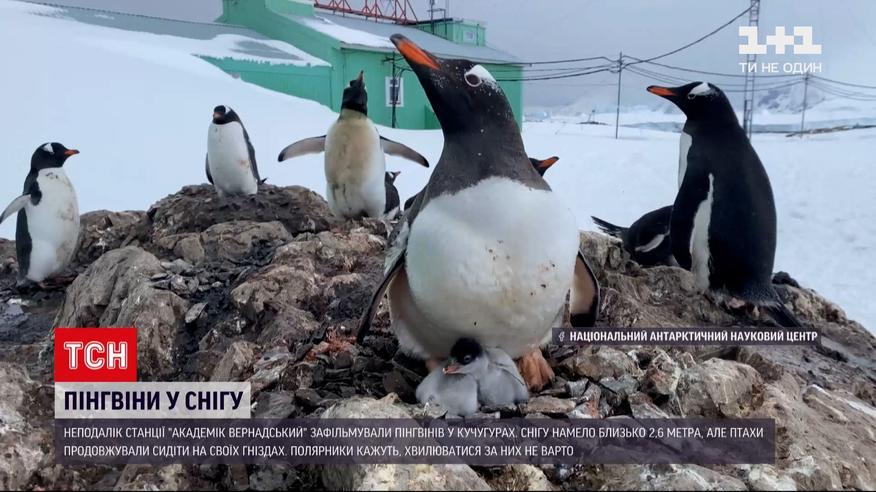 Неподалік української станції Академік Вернадський в Антарктиді зафільмували пінгвінів у кучугурах. Снігу намело понад 2,5 метри і товстий шар накрив і гнізда, де птахи саме висиджували яйця. Та от з місця пінгвіни навіть і не думали зрушати. Так і лишилися там, тільки голови стирчали з кучугур. Хвилюватися за тварин - кажуть наші полярники - не варто. Бо пінгвіни до снігу пристосовані і можуть самі відкопувати свої гнізда.
