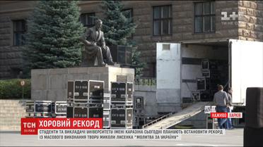 Біля одного з корпусів національного університету імені Каразіна тривають останні приготування до встановлення грандіозного співочого рекорду. Його близько трьох тисяч людей мають встановити просто неба. Встановлювати рекорд будуть студенти університету, учні ліцею, викладачі, ректор і кілька професійних хорів.