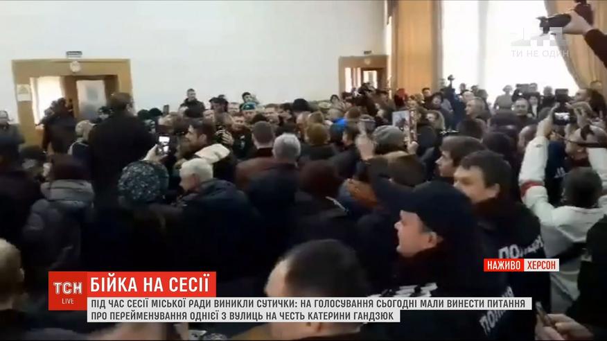 Массова бійка на сесії Херсонської міської ради. Сьогодні на засіданні депутати вирішують, чи перейменовувати вулицю Лютеранську на честь загиблої активістки Катерини Гандзюк. Саме з приводу цього виникли суперечки.
