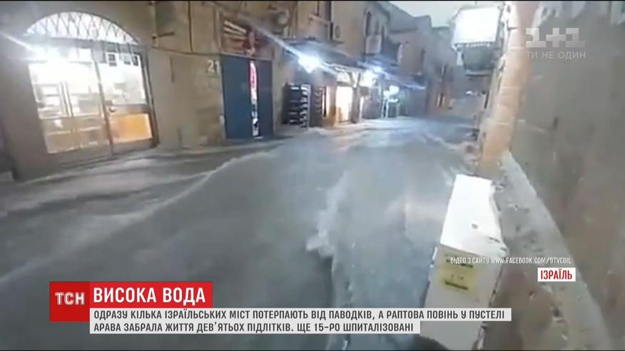 Висока вода накрила кілька міст, серед яких Єрусалим та Ейлат. Раптова повінь в ізраїльській пустелі забрала життя дев’ятьох підлітків. Ще одна дівчина зникла безвісти. Група з 25 юнаків та дівчат виїхала до пустелі Арава на півдні країни на курси передармійської підготовки. Аж раптом різко зріс рівень води річки Нахаль-Цафіт.